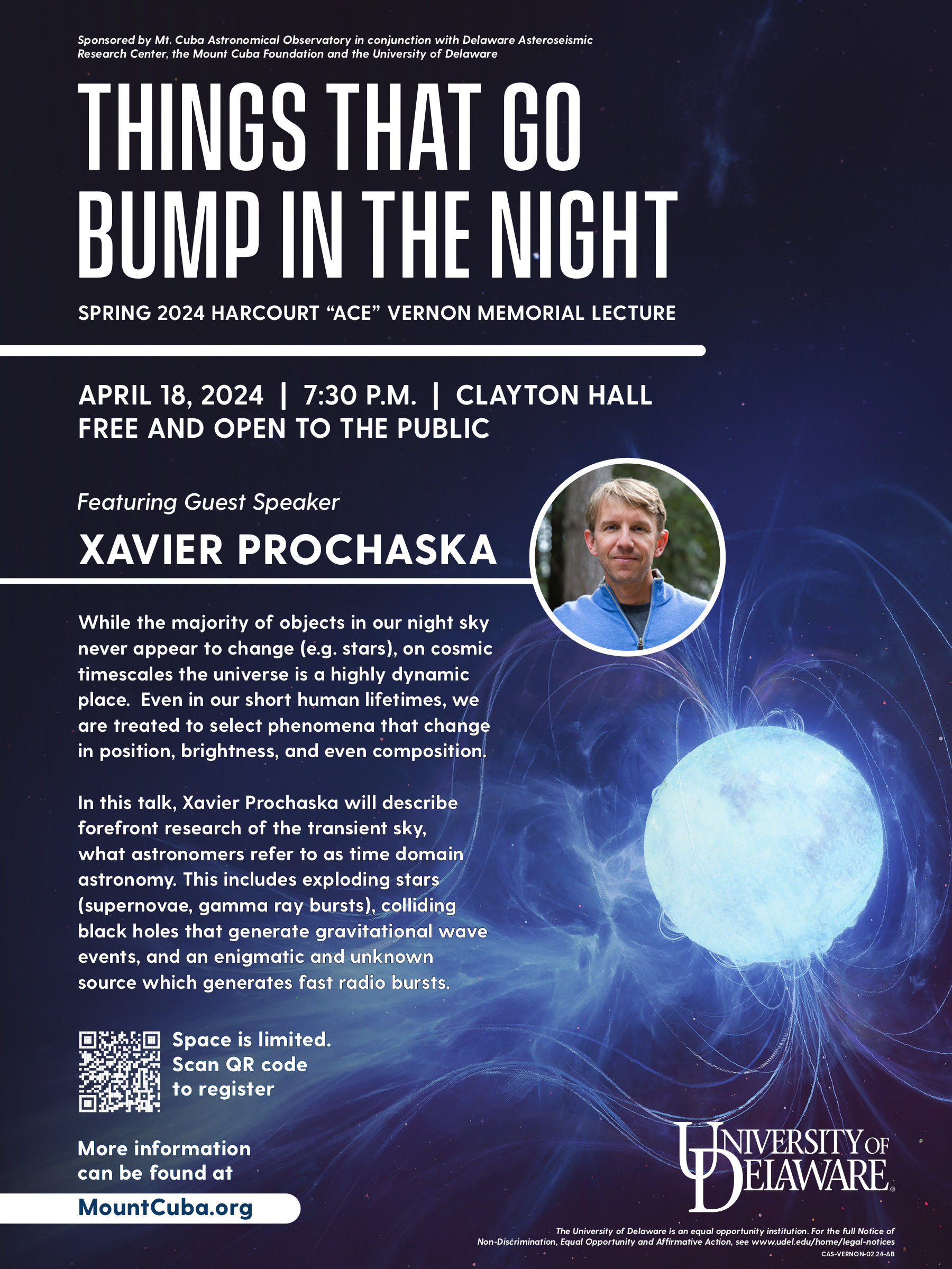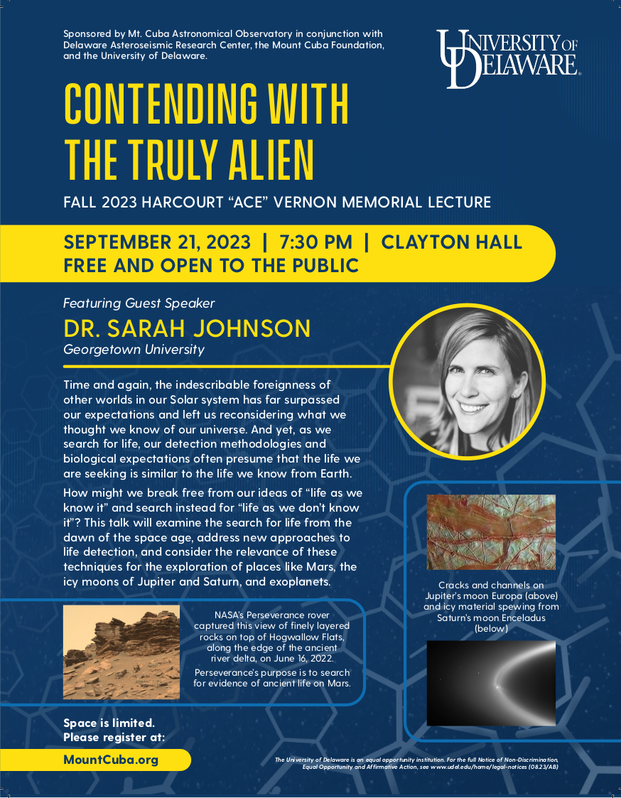 The Mt. Cuba Astronomical Foundation also administers the “Vernon Lecture Fund,” and awards an honorarium to an individual for contributions to astronomy and for delivering a public lecture on astronomical or related topics. The Vernon Lecture, named after one of the co-founders of the Mt. Cuba Astronomical Observatory, has been held annually at the University of Delaware since 1979.